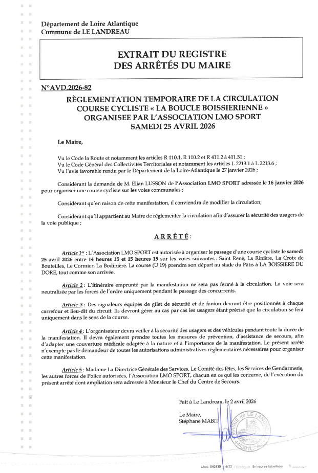 COURSE CYCLISTE « La Boucle Boissiérienne » Actualités Une course cycliste « La Boucle Boissiérienne » passera sur la Commune le samedi 25 avril 2026. 14 avril 2026/par communication@le-landreau.fr https://le-landreau.fr/wp-content/uploads/2026/04/course.png 484 516 communication@le-landreau.fr https://le-landreau.fr/wp-content/uploads/2021/01/HeaderMask-1-300x111.png communication@le-landreau.fr2026-04-14 12:55:212026-04-14 12:57:27COURSE CYCLISTE « La Boucle Boissiérienne »