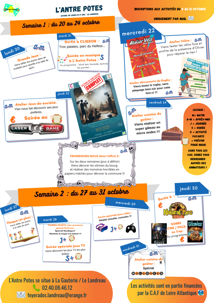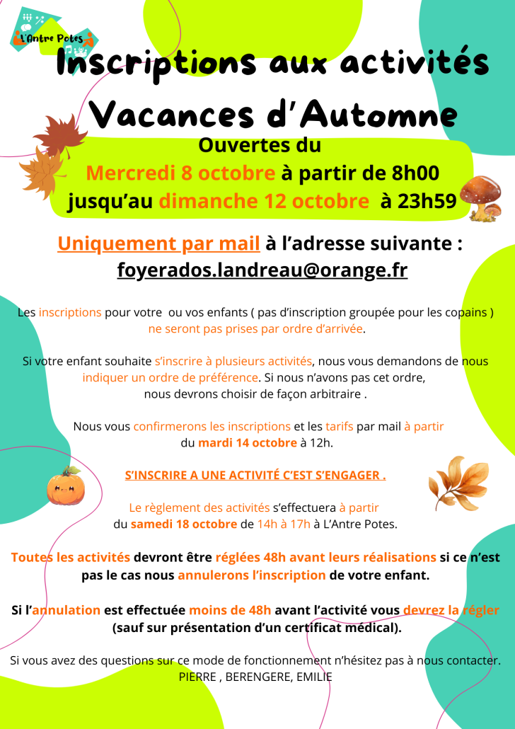 Modalités d’inscription : Possibilité de s’inscrire tout le long de l’année auprès de l’équipe aux jours et heures d’ouverture. Pour les activités, un programme est envoyé aux inscrits par courrier et par mail, deux semaine environ avant le début des vacances + information dans la Vie Landréenne et Site Internet de la commune.