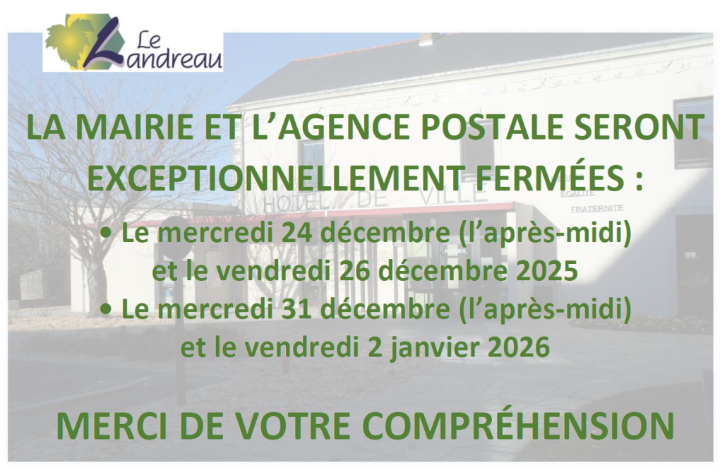 https://le-landreau.fr/wp-content/uploads/2025/12/Fermeture-Mairie.png8641330communication@le-landreau.frhttps://le-landreau.fr/wp-content/uploads/2021/01/HeaderMask-1-300x111.pngcommunication@le-landreau.fr2025-12-22 08:55:252025-12-22 08:55:25FERMETURE Mairie et Agence Postale