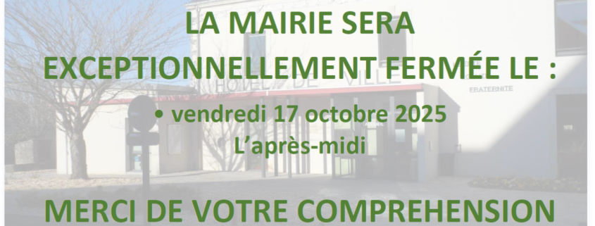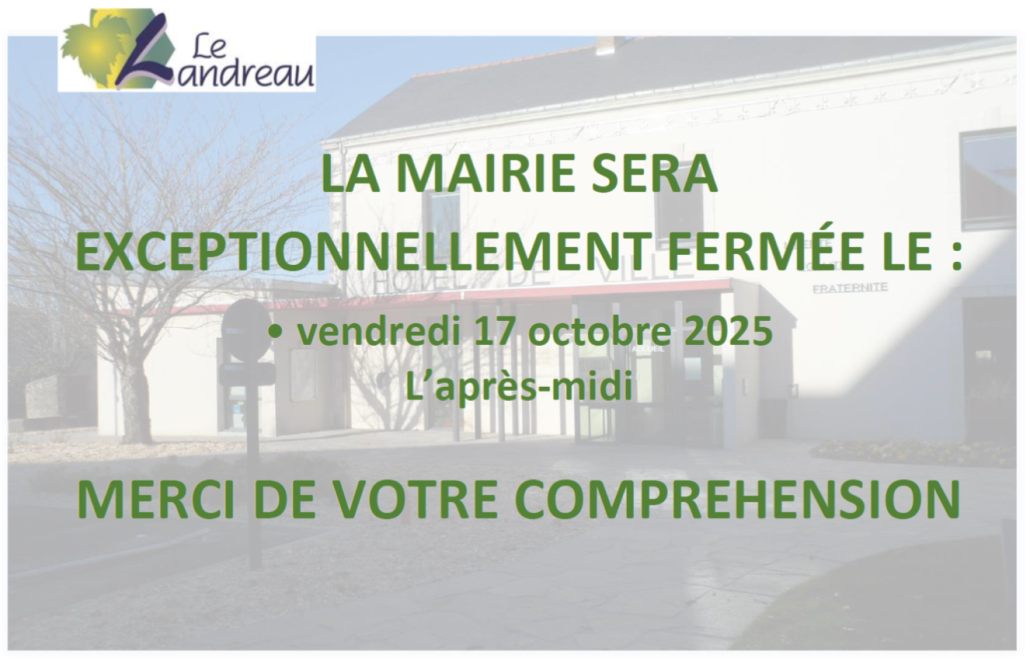 LA MAIRIE SERA EXCEPTIONNELLEMENT FERMÉE Actualités 17 octobre 2025/par communication@le-landreau.fr https://le-landreau.fr/wp-content/uploads/2025/10/Fermeture.png 848 1326 communication@le-landreau.fr https://le-landreau.fr/wp-content/uploads/2021/01/HeaderMask-1-300x111.png communication@le-landreau.fr2025-10-17 11:56:132025-10-17 11:56:20LA MAIRIE SERA EXCEPTIONNELLEMENT FERMÉE
